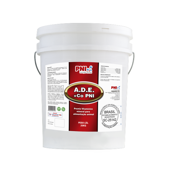 A.D.E. + Co PNI é um complexo de vitaminas A, D e E,associado ao micromineral Cobalto, indicado para bovinos, ovinos, caprinos e equinos.